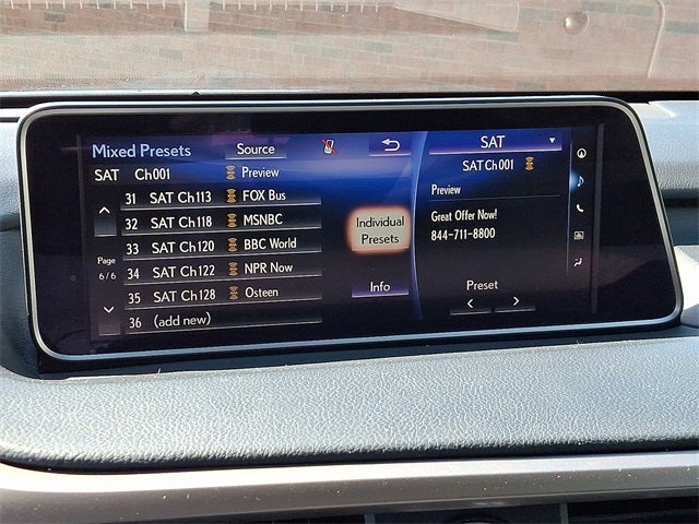 - Radio: AM/FM/CD Lexus Display Audio -inc: 8-inch screen, 9-speaker premium audio system, Bluetooth® hands free phone and automatic phonebook download capabilities, Scout GPS link app-based turn-by-turn directions, voice recognition, Cache Radio, ability to pause live AM/FM radio and HD Radio, traffic and weather data provided via HD Radio (free to all users while in HD Radio range), basic traffic map, weather forecast, Siri Eyes Free and Electro Multi Vision (EMV) display
