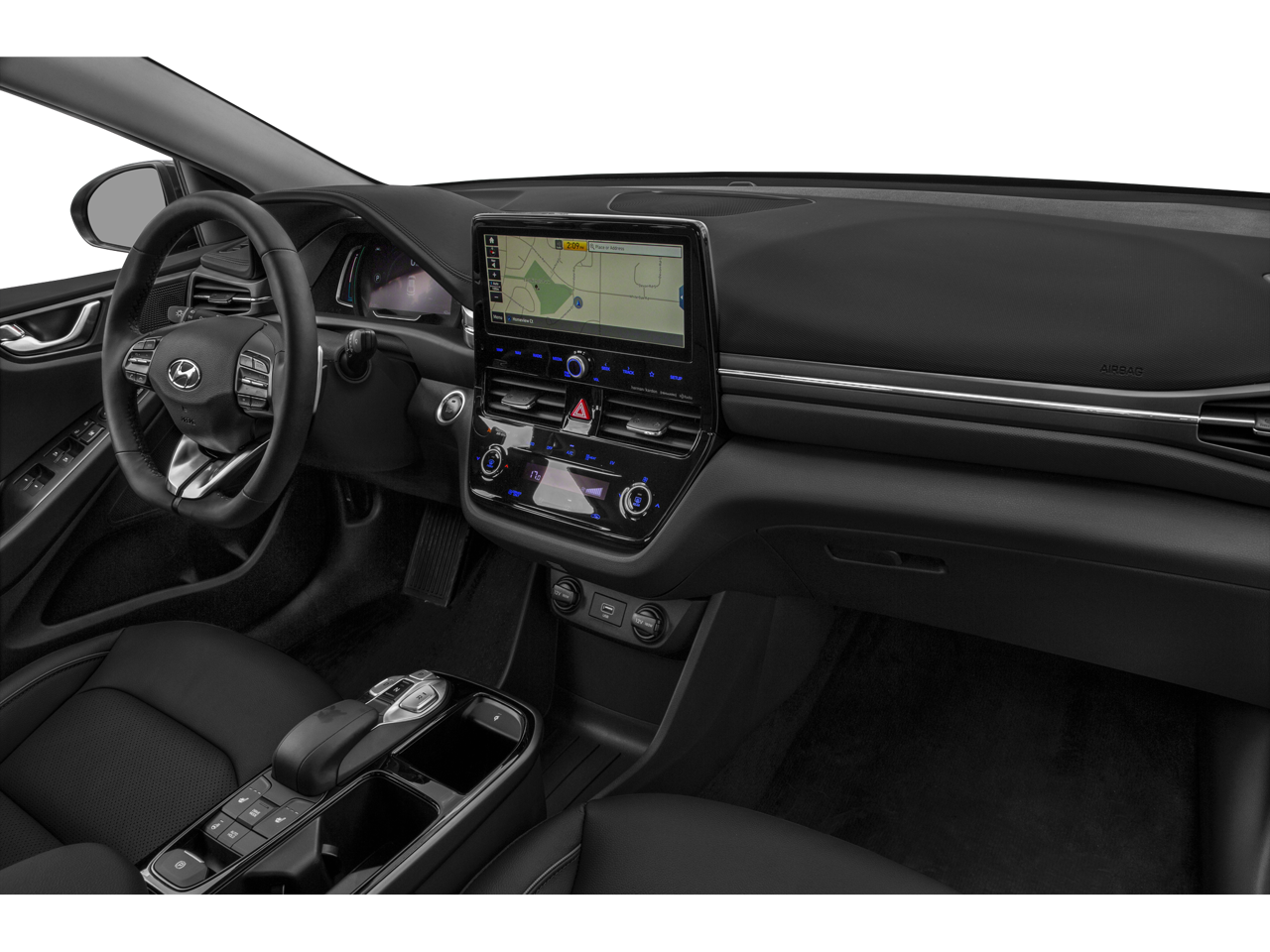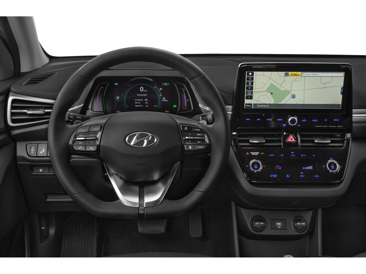 THIS VEHICLE INCLUDES THE FOLLOWING FEATURES AND OPTIONS: Option Group 01, 4-Wheel Disc Brakes, 8 Speakers, ABS brakes, Air Conditioning, Alloy wheels, AM/FM radio: SiriusXM, Apple CarPlay & Android Auto, Auto High-beam Headlights, Auto-dimming Rear-View mirror, Automatic temperature control, Bodyside moldings, Brake assist, Bumpers: body-color, Delay-off headlights, Driver door bin, Driver vanity mirror, Dual front impact airbags, Dual front side impact airbags, Electronic Stability Control, Emergency communication system: Blue Link Connected Car Service (3-year complimentary subscription), Exterior Parking Camera Rear, Front anti-roll bar, Front Bucket Seats, Front Center Armrest, Front reading lights, Front wheel independent suspension, Fully automatic headlights, Garage door transmitter: HomeLink, harman/kardon® Speakers, Heated door mirrors, Heated Front Bucket Seats, Heated front seats, Illuminated entry, Knee airbag, Leather Seating Surfaces, Low tire pressure warning, Memory seat, Navigation System, Occupant sensing airbag, Outside temperature display, Overhead airbag, Overhead console, Panic alarm, Passenger door bin, Passenger vanity mirror, Power door mirrors, Power driver seat, Power moonroof, Power steering, Power windows, Radio: AM/FM Premium Display Audio, Rear seat center armrest, Rear window defroster, Remote keyless entry, Security system, Speed control, Speed-sensing steering, Split folding rear seat, Spoiler, Steering wheel mounted audio controls, Telescoping steering wheel, Tilt steering wheel, Traction control, Trip computer, Turn signal indicator mirrors, Variably intermittent wipers, and Wheels: 16 x 6.5J Aluminum Alloy (EV Design). 145/121 City/Highway MPG