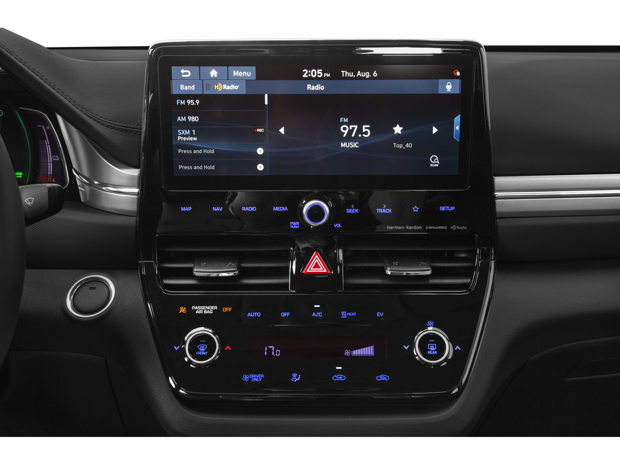 - Radio: AM/FM Premium Display Audio -inc: harman/kardon audio, 10.25" high resolution touchscreen display, navigation, Clari-Fi music restoration technology, 8 speakers, USB inputs, Apple CarPlay, Android Auto, HERE HD Traffic, speed-sensitive automatic volume control, integrated Bluetooth® w/phonebook transfer and voice recognition, Blue Link connected car services, SiriusXM radio, HD Radio technology and wireless phone charger
