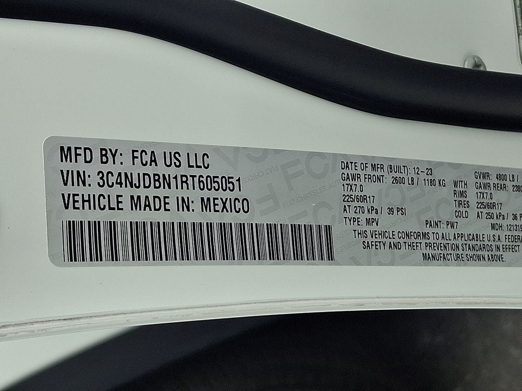 THIS VEHICLE INCLUDES THE FOLLOWING FEATURES AND OPTIONS: Quick Order Package 29J Latitude, 4WD, 17 x 7.0 Aluminum Wheels, 17 x 7 Aluminum Wheels, 3.73 Final Drive Ratio, 4-Wheel Disc Brakes, 6 Speakers, ABS brakes, Air Conditioning, Alloy wheels, AM/FM radio: SiriusXM, Auto High-beam Headlights, Brake assist, Bumpers: body-color, Compass, Delay-off headlights, Driver door bin, Driver vanity mirror, Dual front impact airbags, Dual front side impact airbags, Electronic Stability Control, Emergency communication system: Jeep Connect, Four wheel independent suspension, Front anti-roll bar, Front Bucket Seats, Front Center Armrest w/Storage, Front fog lights, Front License Plate Bracket, Front reading lights, Fully automatic headlights, Heated door mirrors, Illuminated entry, Knee airbag, Leather Shift Knob, Leather steering wheel, Low tire pressure warning, Occupant sensing airbag, Outside temperature display, Overhead airbag, Overhead console, Panic alarm, ParkView Rear Back-Up Camera, Passenger door bin, Passenger vanity mirror, Power door mirrors, Power steering, Power windows, Premium Cloth/Vinyl Bucket Seats, Radio: Uconnect 5 w/10.1 Display, Rear anti-roll bar, Rear seat center armrest, Rear window defroster, Rear window wiper, Remote keyless entry, Security system, Speed control, Split folding rear seat, Spoiler, Steering wheel mounted audio controls, Tachometer, Telescoping steering wheel, Tilt steering wheel, Traction control, Trip computer, and Variably intermittent wipers. 24/32 City/Highway MPG