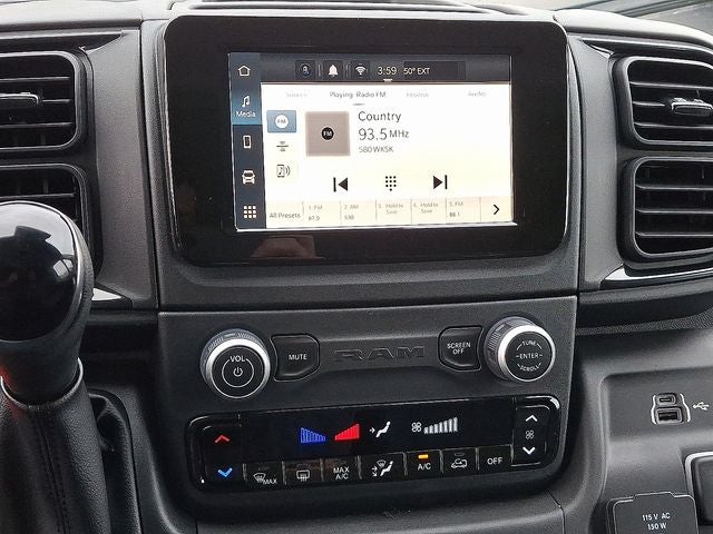 THIS VEHICLE INCLUDES THE FOLLOWING FEATURES AND OPTIONS: Convenience Group (Adaptive Cruise Control w/Stop & Go, Exterior Mirrors w/Heating Element, Exterior Mirrors w/Supplemental Signals, Front Fog Lamps, Power Adjust Mirrors, Power Folding/Heated Mirrors, Power-Adjustable Convex Aux Mirrors, Power-Folding Mirrors, and Rear Cargo LED Lamp), MOPAR Side Wall Paneling U & L (Side Wall Paneling Lower), Power Group (100 Amp Battery, 115V Auxiliary Power Outlet, and 12V Rear Auxiliary Power Outlet), Quick Order Package 22B Tradesman w/Pass Seat (4-Way Manual Adjust Front Passenger Seat and Passenger Bucket Seat), Safety Group (Blind Spot & Cross Path Detection, Digital Rearview Mirror w/Autodim, Intelligent Speed Assist (ISA), Lane Departure Warning Plus, and ParkSense Front/Rear Park Assist System), Upfitter's Prep Package (Auxiliary Switches and Upfitter Electronic Module (VSIM)), 4 Speakers, 4-Wheel Disc Brakes, 4.08 Axle Ratio, 77 mph Maximum Speed, ABS brakes, Air Conditioning, AM/FM radio: SiriusXM, Apple CarPlay/Android Auto, Black/Gray Seats, Bodyside moldings, Brake assist, Cloth Bucket Seats, Driver door bin, Driver Seat Armrest, Driver's Seat Mounted Armrest, Electronic Stability Control, Front anti-roll bar, Front Bucket Seats, Front License Plate Bracket, Front reading lights, Front wheel independent suspension, Heavy Duty Suspension, Illuminated entry, Low tire pressure warning, MOPAR Cargo Compartment Floor Mat, MOPAR Rear Assist Handles, Outside temperature display, Overhead airbag, Overhead console, ParkView Rear Back-Up Camera, Passenger door bin, Power steering, Power windows, Radio: Uconnect 5 w/7 Display, Remote keyless entry, Steering wheel mounted audio controls, Tachometer, Telescoping steering wheel, Traction control, Trip computer, Turn signal indicator mirrors, Variably intermittent wipers, Wheel Center Cap, and Wheels: 16 x 6.0 Steel.
